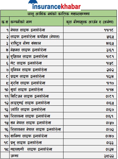 प्रारम्भिक रुपमा संकलन गरिएको तथ्याङ्क अनुसार चालु आर्थिक बर्षको कात्तिक मसान्तसम्ममा सबैभन्दा धेरै बीमाशुल्क आर्जन गर्न कम्पनी नेपाल लाइफ इन्स्योरेन्स रहेको छ । कम्पनीले असार मसान्तसम्ममा ११ अर्ब १८ करोड रुपैयाँ बीमाशुल्क आर्जन गर्न सफल भएको छ ।