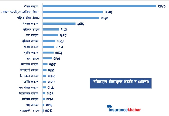 त्यस्तै, सिटिजन लाइफले ३८ करोड रुपैयाँ, आइएमई लाइफले ३० करोड रुपैयाँ, ज्योति लाइफले २९ करोड रुपैयाँ, रिलायन्स लाइफले २९ करोड रुपैयाँ, सन नेपाल लाइफले २६ करोड रुपैयाँ, रिलायबल नेपाल लाइफले २१ करोड रुपैयाँ, सानिमा लाइफले १७ करोड रुपैयाँ, प्रभु लाइफले १५ करोड रुपैयाँ र महालक्ष्मी लाइफले आठ करोड रुपैयाँ नविकरण बीमाशुल्क आर्जन गरेका छन् ।
