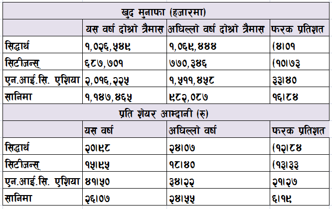त्यस्तै एनआईसी एसिया बैंक र सानिमा बैंकको प्रति शेयर आम्दानी क्रमश:२१ दशमलव २७ र ६ दशमलव १९ प्रतिशतले वृद्धि भएको छ भने सिटिजन्स बैंक र सिद्धार्थ बैंकको प्रति शेयर आम्दानी क्रमश: १३ दशमलव ३३ र १२ दशमलव ८४ प्रतिशतले घटेको छ।
