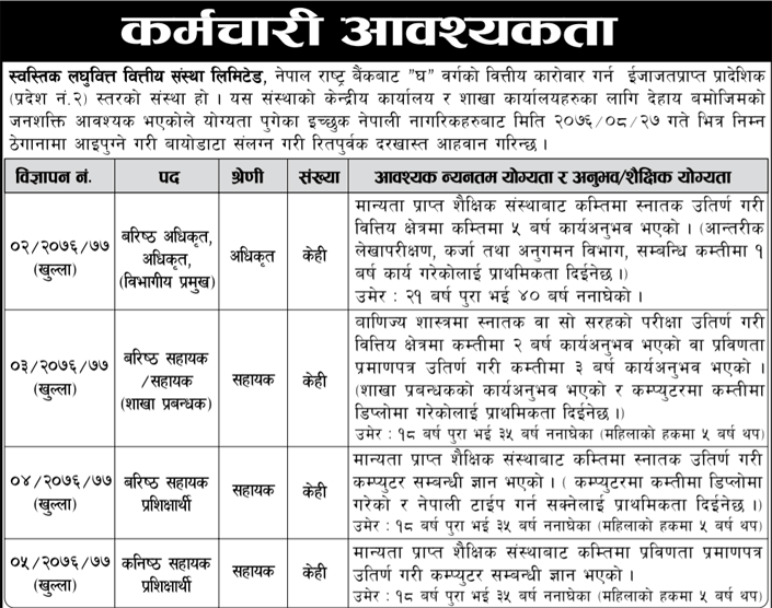 त्यस्तै, स्वस्तिक लघुवित्त वित्तीय संस्थाले कनिष्ठ सहायक प्रशिक्षर्थीदेखि वरिष्ठ अधिकृतसम्मका लागि कर्मचारीको माग गरेको छ । इच्छुक तथा योग्उयता पुगेकाले मसिंर २७ गतेभित्र आवेदन दिइसक्नुपर्नेछ ।