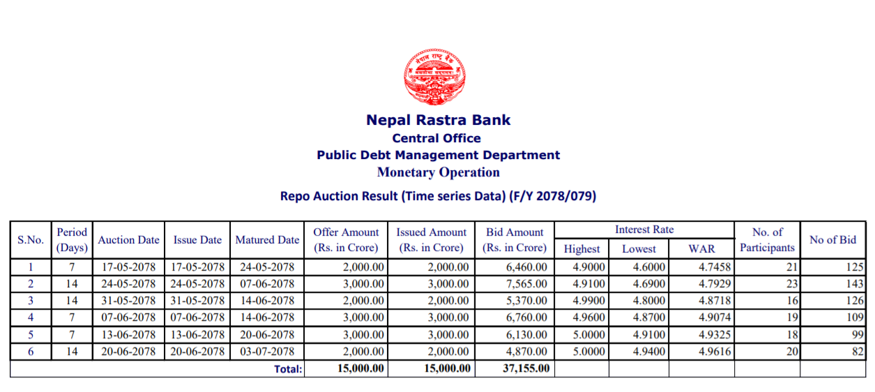 राष्ट्र बैंकले भदौ १७ गतेयता पटक पटक गरेर ६ पटक रिपो जारी गरिसकेको छ । यस अवधिमा राष्ट्र बैंकले सात दिने र चौध दिने अवधिको गरी कूल १ खर्ब ५० अर्ब रुपैयाँ अल्पकालीन कर्जा उपलब्ध गराएको थियो । रिपो अन्तर्गत अवधि समाप्त भएपछि सम्बन्धित बैंक वित्तीय संस्थाले कबुल गरेको ब्याज सहित राष्ट्र बैंकलाई कर्जा रकम फिर्ता गर्नुपर्छ ।