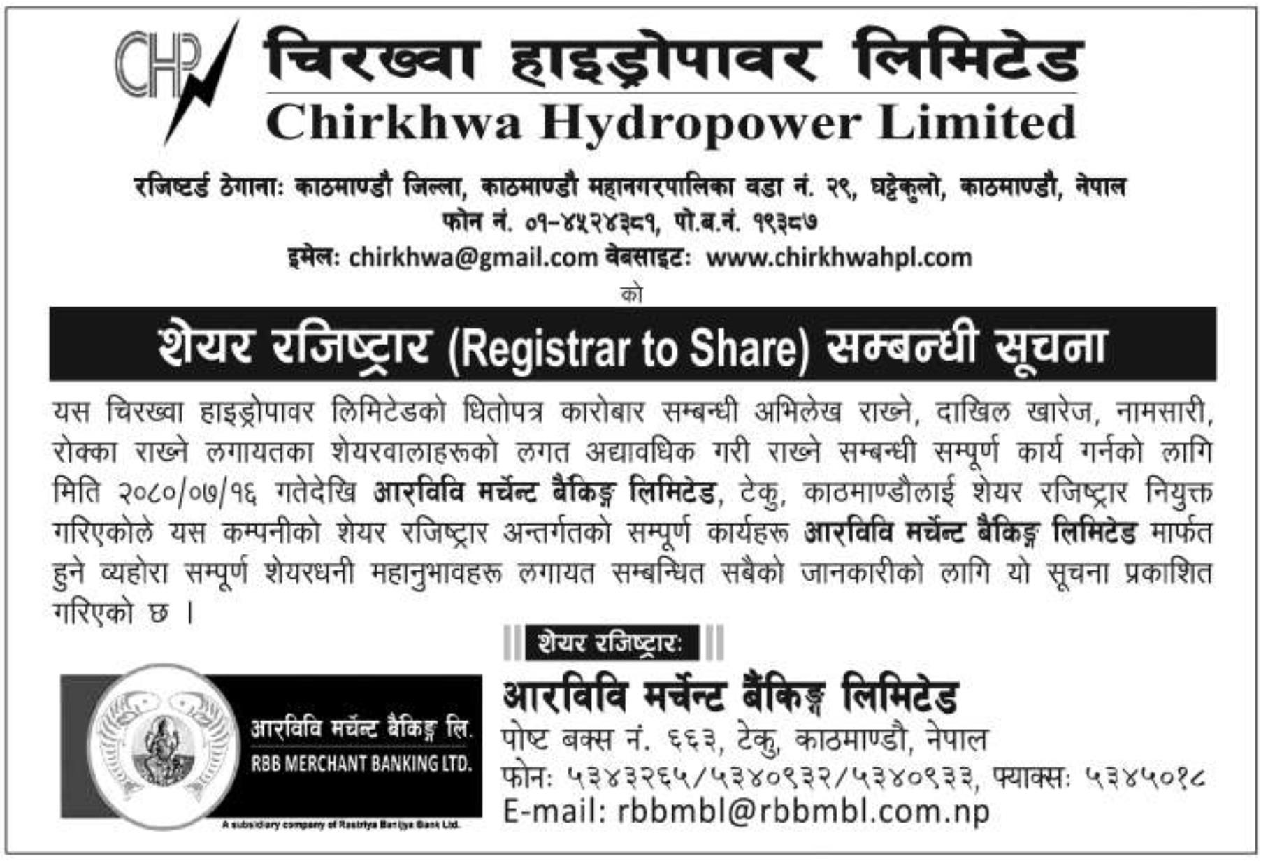 काठमाडौं । चिरख्वा हाइड्रोपावर लिमिटेडको शेयर रजिष्ट्रारमा आरबिबि मर्चेन्ट बैंकिङ्ग लिमिटेड नियुक्त भएको छ । कम्पनीले कात्तिक १६ गते देखि लागू हुने गरी शेयर रजिष्ट्रारमा आरविवि मर्चेन्ट बैंकिङ्गलाई नियुक्त गरेको हो ।