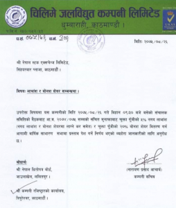 चिलिमे जलविधुत कम्पनी लिमिटेडले २५ प्रतिशत लाभांश दिने भएको छ । कम्पनीको बुधबार बसेको सञ्चालक समितिकोे बैठकले गत आवको मुनाफा बाट ५ प्रतिशत नगद लाभांश र २० प्रतिशत बोनस सेयर गरी जम्मा २५ प्रतिशत लाभांश दिने निर्णय गरेको छ ।
