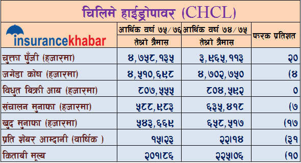 हाईड्रोपावरको लिडर चिलिमे हाइड्रोपावरले पनि लगानीकर्तालाई निरास बनाउने खालको वित्तिय विवरण सार्वजनिक गरेको छ। विधुत बिक्री आयमा गिरावट नदेखिए पनि कम्पनीको खर्चमा आएको वृद्धिको कारणले गर्दा कम्पनीको संचालन मुनाफामा ७ प्रतिशतको गिरावट देखिएको छ।