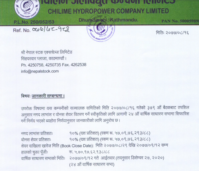 काठमाडौं । चिलिमे जलविद्युत कम्पनीले लाभांश प्रस्ताव गरेको छ । कम्पनीको मंगलबार बसेको संचालक समितिको बैठकले आर्थिक वर्ष ७६/७७ को मुनाफाबाट वितरण गर्ने लाभांश प्रस्ताव गरेको हो ।