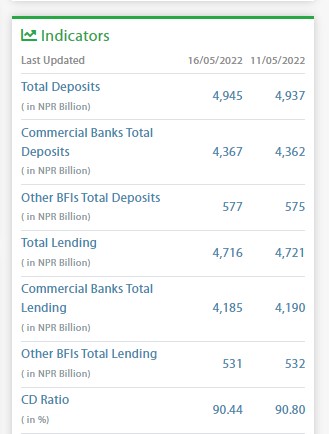 हाल बैंकहरुमा ४९ खर्ब ४५ अर्ब निक्षेप रहेकोमा वाणिज्य बैंकहरुमा मात्र ४३ खर्ब ६७ अर्ब निक्षेप रहेको छ । समिक्षा अवधिमा कर्जा प्रवाह भने घटेको छ । निकै धेरै दिन सार्वजनिक विदा परेको र असार मसान्तसम्म वाणिज्यबैंकहरुलाई ९० प्रतिशत सिडी रेसियो कायम गर्न कारण कर्जा प्रवाहमा कडाईको कारणले गर्दा पनि कर्जा प्रवाहमा वृद्धि नभएको देखिन्छ। कर्जा प्रवाह ५ अर्बले घटेको छ।