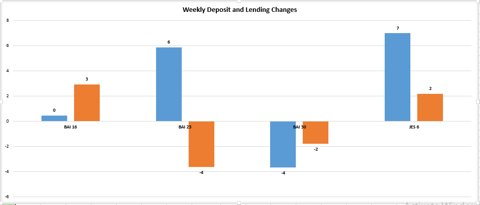 त्यस्तै, बैशाख १६ गते देखि २३ गतेसम्म ५ अर्ब रुपैयाँले निक्षेप बढेर ४३ खर्ब ७३ अर्ब पुगेको थियो । बैशाख २३ गते देखि ३० गते सम्म आइपुग्दा उक्त निक्षेप घटेर ४३ खर्ब ७० अर्ब रुपैयाँमा पुगेको नेपाल बैंकर्स संघको तथ्यांकमा उल्लेख छ ।