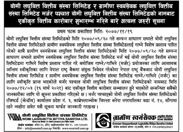 मर्जर पश्चात वोमी लघुवित्त वित्तीय संस्था लिमिटेडको नामबाट कारोबार हुने संस्थाले जनाएको छ । दुवै संस्थाको पुस २८ गते सम्पन्न साधारण सभाले एक आपसमा मर्जरमा जाने प्रस्ताव पारित गरेका थिए ।