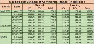 चैत २० गतेसम्ममा बैंकहरुले ३५ खर्ब एक अर्ब रुपैयाँ कर्जा लगानी गरेका छन् भने ३८ खर्ब ९० अर्ब रुपैयाँ निक्षेप संकलन गरेका छन् । चैत अन्तिम दुई सातामा बैंकहरुले किस्ता र व्याज उठाउने भएकाले बैंकमा निक्षेप थुप्रिएको हो । कतिपय व्यवसायमा पुनरकर्जाको सुविधा भएकाले त्यसले केहि हदसम्म बैंकहरुको ऋण विस्तार धेरै देखिएको हो ।