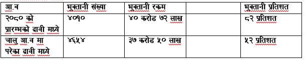 भुक्तानी भएका दाबीहरु मध्ये कृषिसँग सम्बन्धीत १७९६ दाबीको कुल रु. ८ करोड ४४ लाख भन्दा बढीको दाबी रकम भुक्तानी गरिएको छ ।