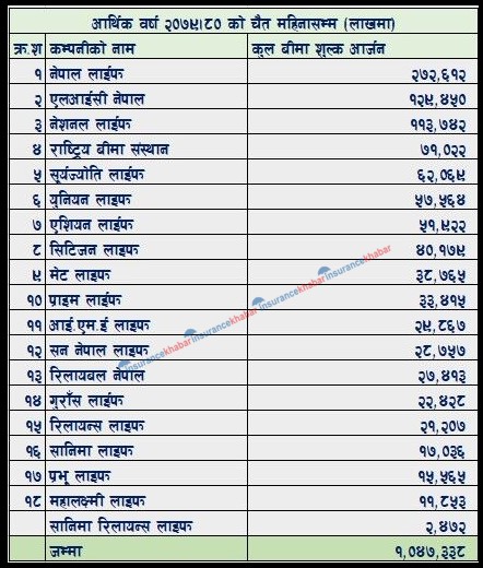 यस अवधिसम्ममा सबैभन्दा धेरै नेपाल लाइफले कुल बीमा शुल्क आर्जन गरेका छन् । यस अवधिसम्म्मा कम्पनीले २७ अर्ब २६ करोड रुपैयाँ कुल बीमा शुल्क आर्जन गरेको छ । दोस्रोमा एलआइसी नेपाल रहेको छ । कम्पनीले १२ अर्ब ९४ करोड रुपैयाँ कुल बीमा शुल्क आर्जन गरेको छ । नेशनल लाइफले ११ अर्ब ३७ करोड रुपैयाँ कुल बीमा शुलक आर्जन गरेको छ ।