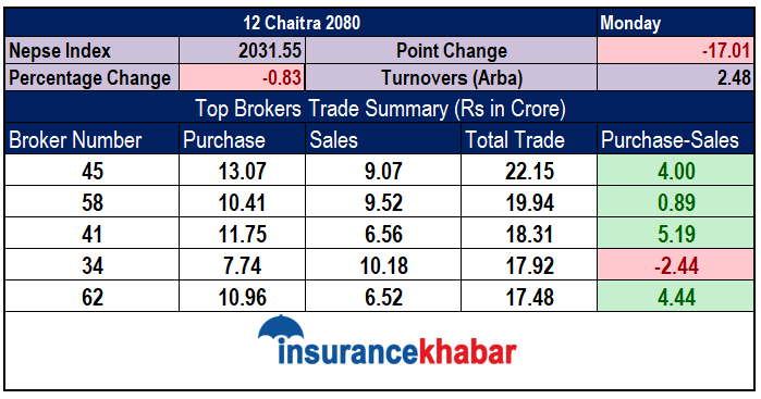 त्यस्तै दोश्रोमा ब्रोकर नम्बर ५८ बाट १० करोड ४१ लाखको खरीद छ भने ९ करोड ५२ लाखको विक्री छ । आज कारोबार गर्ने शिर्ष ५ ब्रोकरमध्ये ४ ब्रोकरले खरिद धेरै गरेका छन् भने १ बाट विक्री धेरै भएको छ ।