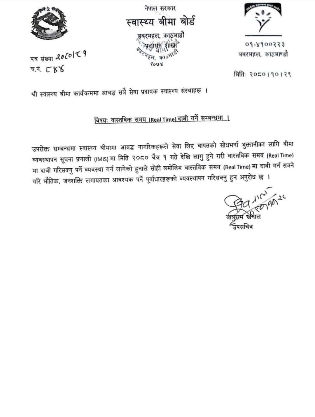 बोर्डले स्वास्थ्य बीमामा आबद्ध नागरिकहरुले सेवा लिए वापतको सोधभर्ना भुक्तानीका लागि बीमा व्यवस्थापन सूचना प्रणाली लागू गर्न लागेको हो । सो मितिबाट लागू हुनेगरि वास्तविक समयमा दाबी गरिसक्नुपर्ने व्यवस्था गर्न लागेको हुनाले सोही बमोजिम वास्तविक समयमा दाबी गर्न सक्ने गरि आवश्यक पुर्वाधार व्यवस्थापन गर्न आग्रह गरेको हो ।