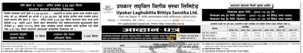 काठमडौं । उपकार लघुवित्त वित्तीय संस्था लिमिटेडले चैत २५ गतेदेखि आइपीओ निष्काशन तथा विक्री खुला गर्ने भएको छ । कम्पनीले जारी पूँजी ६ करोड ५६ लाख २५ हजार ३६ प्रतिशतले हुन आउने २ करोड ३६ लाख २५ हजार बराबरको प्रतिशेयर एक सय रुपैयाँ अंकित दरका २ लाख ३६ हजार २५० कित्ता साधारण शेयर निष्काशन गर्न लागेको हो ।