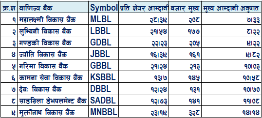 हाल नेप्सेमा कारोबार भइरहेका ९ वटा राष्ट्रिय स्तरका विकास बैंकहरु सबैको मूल्य आम्दानी अनुपात १५ गुणा भन्दा कम छ ।