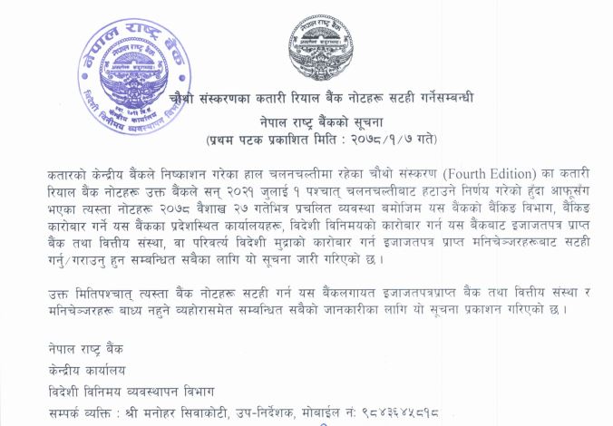 काठमाडौं । नेपाल राष्ट्र बैंकले कतारको केन्द्रीय बैंकले निष्काशन गरेका हाल चलनचल्तीमा रहेका चौथो संस्करणका कतारी रियाल बैंक नोटहरु आगामी बैशाख २७ गते भित्र सटही गर्न निर्देशन दिएको छ । उक्त बैंक नोटहरु सन् २०२१ जुलाई एक पछि चलनचल्तीबाट हटाउने निर्णय भएकाले राष्ट्र बैंकले यस्तो निर्देशन दिएको हो । नेपाल राष्ट्र बैंकको बैंकिङ विभाग, बैंकिङ कारोबार गर्ने नेपाल राष्ट्र बैंकका प्रदेशस्थित कार्यालयहरु, विदेशी विनिमय कारोबार गर्न नेपाल राष्ट्र बैंकबाट इजाजतपत्र प्राप्त बैंक तथा वित्तीय संस्था वा परिवर्त्य विदेशी मुद्राको कारोबार गर्न इजाजतपत्र प्राप्त मनिचेञ्जरहरुबाट सटही गर्न/गराउन विदेशी विनिमय व्यवस्थापन विभागले निर्देशन दिएको हो ।