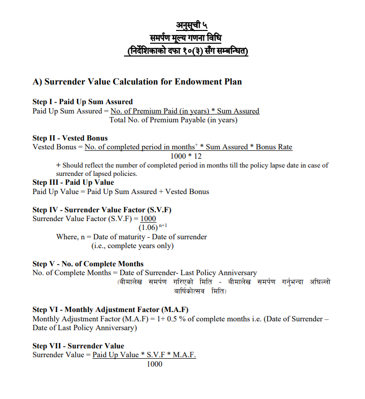 समर्पण मूल्यः प्रतिशत/समर्पण मूल्य गणक*(वार्षिक बीमाशुल्क किस्ता रकम*पुरा भएकाे वार्षिक अवधि)