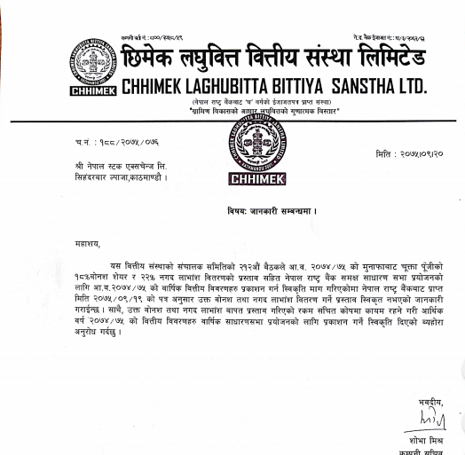 छिमेक लघुवित्तका अनुसार साधारण सभामा पेश गर्न लाभांश प्रस्ताव सहितको गत आर्थिक वर्षको वित्तीय विवरण प्रकाशनका लागि माग गरिएको थियो । तर राष्ट्र बैङ्कले पुस १९ गते पत्र पठाएर उक्त बोनस तथा नगद लाभांश स्वीकृत नभएको जानकारी गराएको जनाइएको छ ।