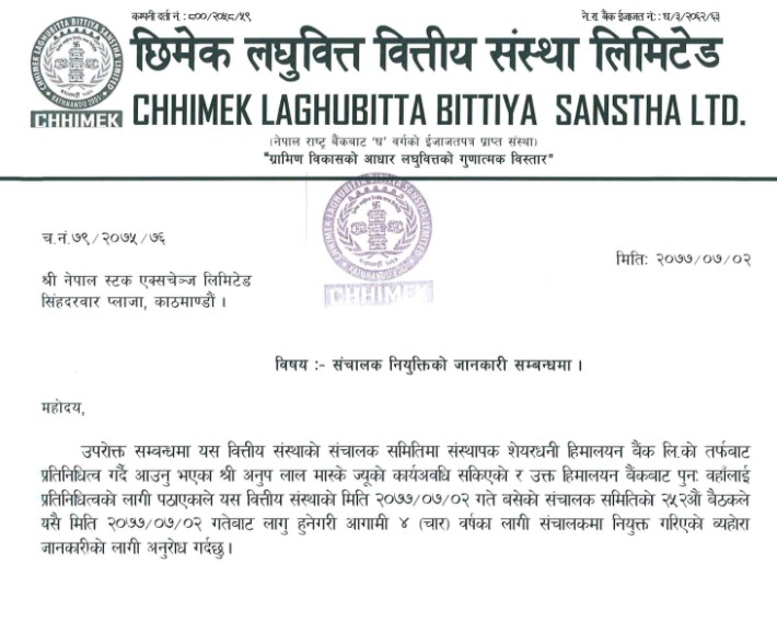 काठमाडौं । छिमेक लघुवित्तको संचालकमा अनुप लाल मास्क नियुक्त भएका छन् । नेपाल स्टक एक्सचेन्ज (नेप्से)ले आज एक सूचना जारी गर्दै अनुप लाल मास्केलाई सञ्चालक पदमा नियुक्त गरिएको लघुवित्तले जनाएको छ ।