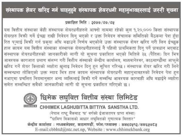 नेपाल राष्ट्र बैंकको निर्देशन बमोजिम सर्वप्रथम संस्थाका संस्थापक शेयरधनीहरुलाई नै प्राथमिकता दिनुपर्ने भएकाले संस्थापक शेयर खरिद गर्न इच्छुक संस्थापक शेयरधनीहरुलाई सूचना प्रकाशन भएको मितिले ३५ दिनभित्र आवश्यक कागजपत्र संकलन गरेर संस्थाको केन्द्रीय कार्यालय, मध्यबानेश्वर, काठमाडौँमा आइपुग्ने गरि निवेदन दिन आग्रह गरेको छ ।