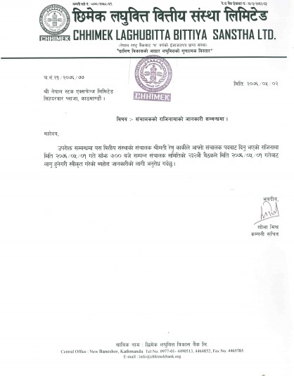 काठमाडौं । छिमेक लघुवित्त वित्तीय संस्थाको सञ्चालक श्रीमति रेणुका कार्कीले दिएको राजीनामा सञ्चालक समितिको २३२ औं बैठकले स्वीकृत गरेको छ ।