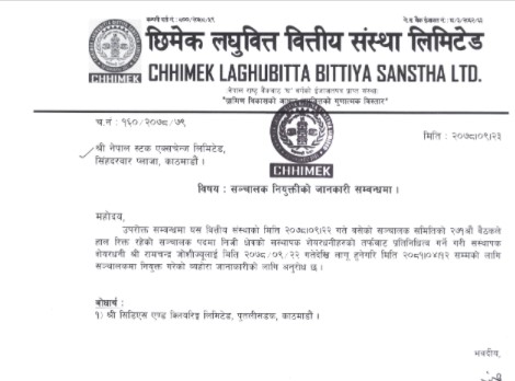काठमाडौं । छिमेक लघुवित्त वित्तीय संस्थाको रिक्त रहेको सञ्चालक पदमा संस्थापक शेयरधनीको तर्फबाट रामचन्द्र जोशी नियुक्त भएका छन् । कम्पनीको पुस २२ गते बसेको सञ्चालक समितिको बैठकले २०७८ पुस २२ गते देखि नै लागू हुने गरी जोशीलाई सञ्चालकमा नियुक्त गरेको कम्पनीले जनाएको छ । उनलाई २०८१ साउन १२ गते सम्मका लागि नियुक्त गरेको हो ।