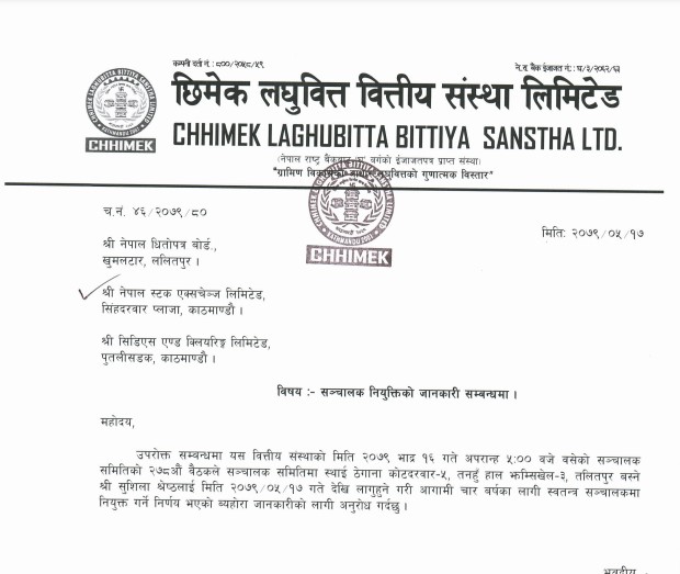 काठमाडौं । छिमेक लघुवित्त वित्तीय संस्थाको स्वतन्त्र सञ्चालकमा सुशिला श्रेष्ठ नियुक्त भएकी छिन् । कम्पनीको भदौ १६ गते बसेको सञ्चालक समितिको बैठकले आगामी चार वर्षका लागि स्वतन्त्र सञ्चालकमा श्रेष्ठलाई नियुक्त गर्ने निर्णय गरेको कम्पनीेले एक सुचना जारी गर्दै जनाएको छ ।