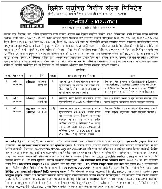काठमाडौं । छिमेक लघुवित्त वित्तीय संस्था लिमिटेडले विभिन्न पदका लागि कर्मचारीको माग गरेको छ । संस्थाले अधिकृत पदका लागि २ जना र सहायक अधिकृतका लागि केही संख्यामा कर्मचारीको माग गरेको जनाएको छ ।
