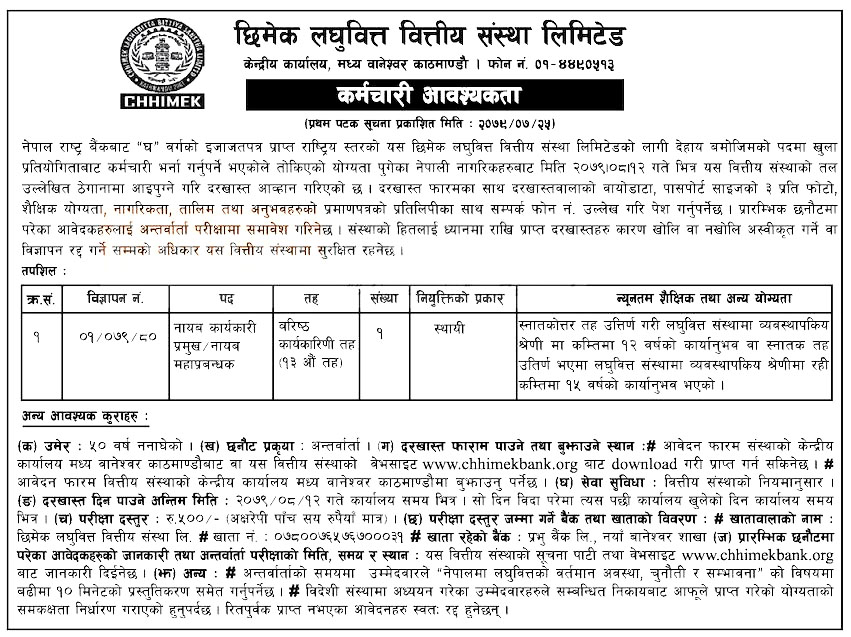 काठमाडौं । छिमेक लघुवित्त वित्तीय संस्था लिमिटेडले विविभन्न पदका लागि कर्मचारीको माग गरेको छ । कम्पनीले एक सुचना जारी गर्दै नायब कार्यकारी प्रमुख नायब महाप्रबन्धक माग गरेको जनाएको छ । उक्त पदका लागि लघुवित्तले स्नाकोत्तर तह उत्तीर्ण गरी लघुवित्त संस्थामा व्यवस्थापकीय श्रेणीमा कम्तिमा १२ वर्षको कार्यानुभव वा स्नातक तह उत्तीर्ण भएमा लघुवित्त संस्थामा व्यवस्थापकीय श्रेणीमा रही कम्तिमा १५ वर्षको कार्यानुभव रहेको हुनुपर्ने जनाएको छ ।