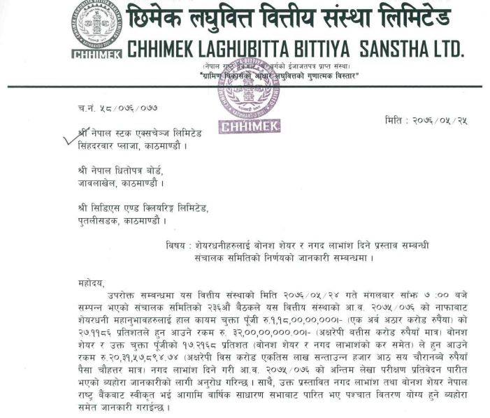 कम्पनीले ३२ करोड रुपैयाँ बराबरको बोनस वितरण गर्नेछ । त्यस्तै, २० करोड ३१ लाख ५७ हजार ८९४ रुपैयाँ नगद बाँड्नेछ ।