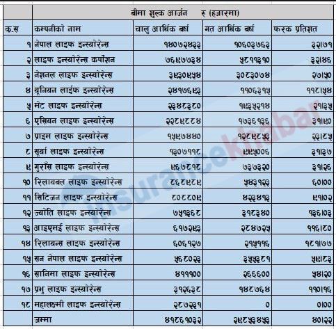 पुस मसान्तसम्ममा सानिमा लाइफले ४१ करोड ११ लाख रुपैयाँ, प्रभु लाइफले ३१ करोड २६ लाख रुपैयाँ र महालक्ष्मी लाइफले २८ करोड ७२ लाख रुपैयाँ बीमाशुल्क आर्जन कुल बीमाशुल्क आर्जन गरेका छन् ।