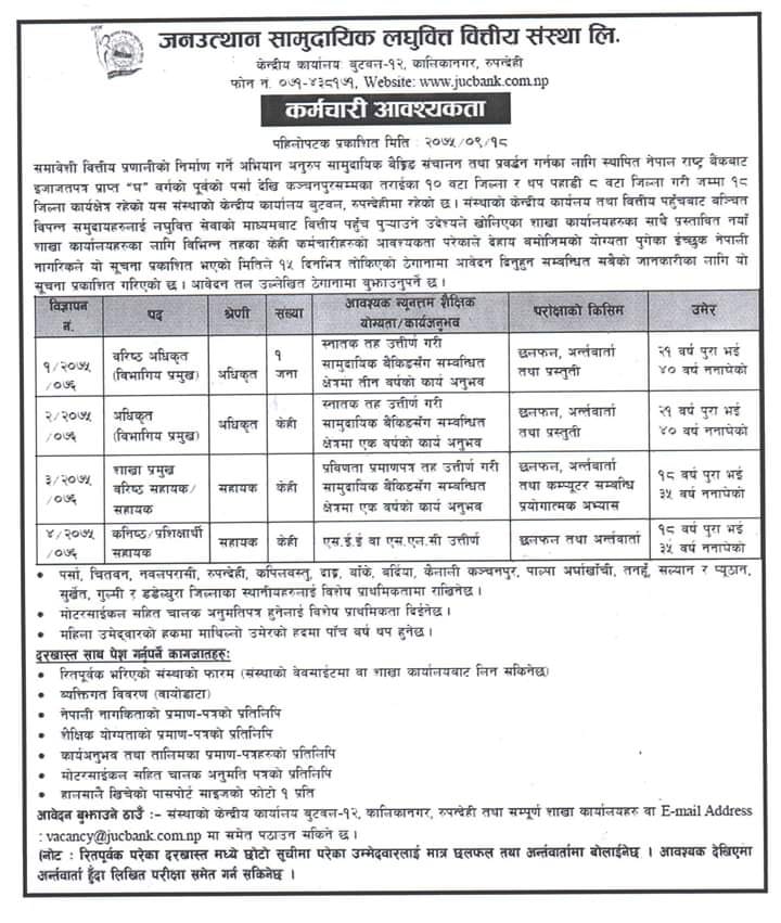 जनउत्थान लघुवित्त वित्तीय संस्था लिमिटेडले विभिन्न पदका लागि दरखास्त आहवान गरेको छ । संस्थाले वरिष्ठ अधिकृत पदका लागि एक जना, अधिकृत पदका लागि केही, शाखा प्रमुख पदका लागि केही र कनिष्ठ प्रशिक्षार्थि सहाय पदका लागि केही संख्याका लागि कर्मचारीको माग गरेको छ ।