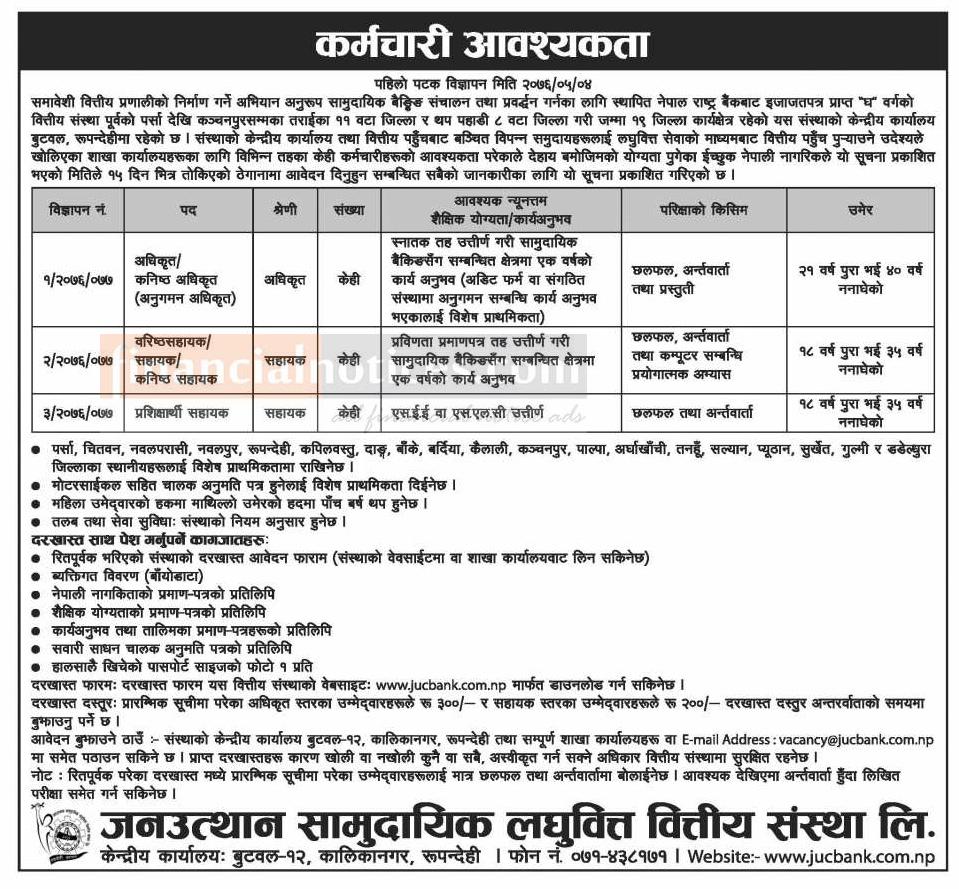 काठमाडौँ । जनउत्थान सामुदायिक लघुवित्त वित्तीय संस्थाले विभिन्न पदमा कर्मचारी माग गरको छ । सस्थाले अधिकृत/कनिष्ठ अधिकृत (अनुगमन अधिकृत), वरिष्ठ सहायक/सहायक/कनिष्ठ सहायक र प्रशिक्षार्थी पदमा केही कर्मचारी माग गरेको हो ।