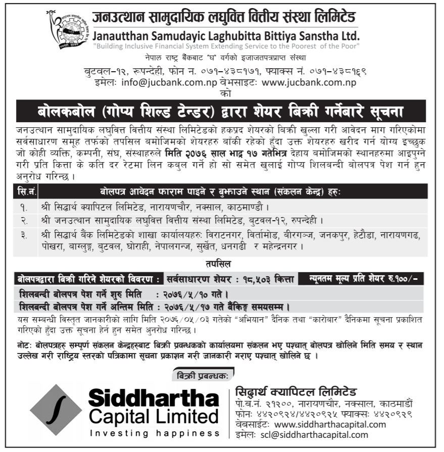 शेयर निष्काशन तथा बिक्रि प्रबन्धक सिद्दार्थ क्यापिटल तथा सिद्दार्थ बैंकका तोकिएका शाखा र लघुवित्तको बुटवल रुपन्देही स्थित कार्यालयबाट आबेदन दिन सक्नेछन ।