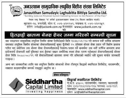 संस्थाको असार २७ गते सम्पन्न भएको नवौँ वार्षिक साधारण सभाले पारित गरेको २५ प्रतिशत बोनस शेयर बुकक्लोज हुँदासम्म शेयर अभौतिकिकरण गराएका शेयरधनीहरुको सम्बन्धित हितग्राही खातामा उक्त शेयर जम्मा गरिएको संस्थाले जनाएको छ ।