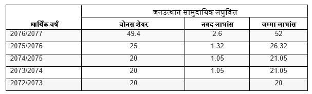 काठमाडौं। जनउत्थान सामुदायिक लघुवित्त वित्तीय संस्थाले गत आर्थिक वर्षको मुनाफा तथा जगेडा कोषबाट चुक्ता पुँजी ५२ प्रतिशत लाभांस दिने घोषणा गरेको छ। संस्थाको माघ १९ गते बसेको सञ्चालक समितिको बैंठकले ४९.४० प्रतिशत बोनस शेयर र बोनस शेयरमा लाग्ने कर प्रयोजनका लागि २.६० प्रतिशत नगद लाभांसको प्रस्ताव गरेको हो।