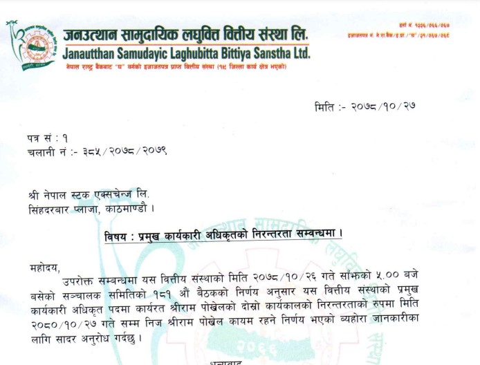 काठमाडौं । जनउत्थान सामुदायिक लघुवित्त वित्तीय संस्थाको प्रमुख कार्यकारी अधिकृत (सीईओ) मा श्रीराम पोख्रेलले निरन्तरता पाएका छन् । कम्पनीको माघ २६ गते बसेको सञ्चालक समितिको बैठकले दोस्रो कार्यकालको लागि पुनः पोख्रेललाई प्रमुख कार्यकारी अधिकृतमा नियुक्ति गर्ने निर्णय गरेको हो ।