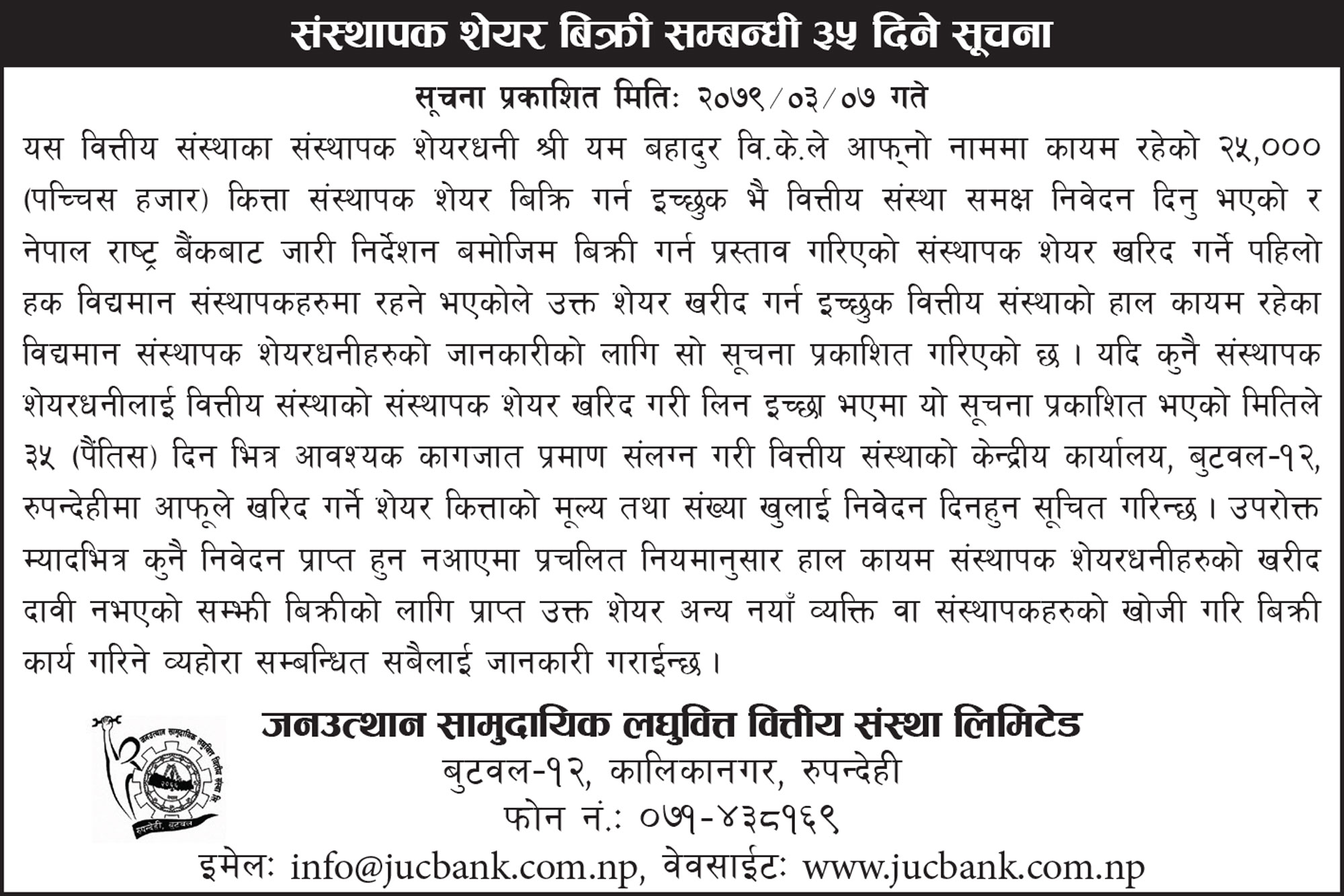 काठमाडौं । जनउत्थान सामुदायिक लघुवित्त वित्तीय संस्था लिमिटेडले २५ हजार कित्ता संस्थापक शेयर विक्री गर्ने भएको छ । उक्त संस्थापक शेयर खरीद गर्न इच्छुक संस्थापक शेयरधनीले सूचना प्रकाशित भएको मितिले ३५ दिनभित्र आवश्यक कागजातसहित कम्पनीको केन्द्रीय कार्यालय बुटवल–१२, रुपन्देहीमा आवेदन दिन सक्नेछन् ।