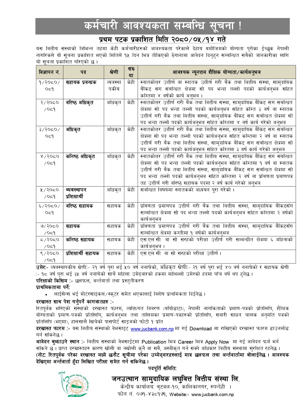 जनउत्थान सामुदायिक लघुवित्तले माग्यो ९ पदका लागि कर्मचारी