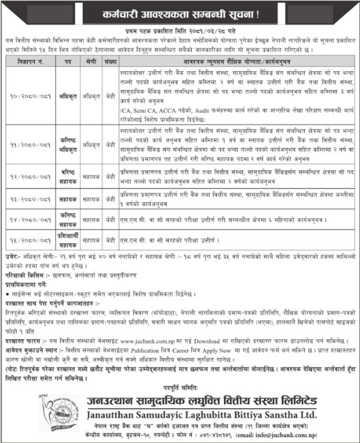 काठमाडौं । जनउत्थान सामुदायिक लघुवित्त वित्तीय संस्थाले विभिन्न पदका लागि कर्मचारी माग गरेको छ । कम्पनीले अधिकृतका लागि केही, कनिष्ठ अधिकृतका लागि केही, वरिष्ठ सहायकका लागि केही, सहायकका लागि केहीकनिष्ठ सहायकका लागि केही, प्रशिक्षार्थीका लागि कही संख्यामा कर्मचारी माग गरेको हो ।