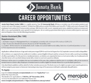 जनता बैंकले ठूलो सङख्यामा कर्मचारी माग गरेको छ । बैंकले जुनियर सहायकमा सयजना कर्मचारी माग गरेको छ । बैंकमा आवेदन दिनको लागि आवेदकको शैक्षिक योग्यता स्नातक तह रहेको र १८ वर्ष भन्दा माथि र २८ बर्ष भन्दा मुनिको हुनुपर्ने रहेको छ । काठमाडौं र बाहिरका जिल्लाहरुको लागि बैंकले ठूलो रुपमा कर्मचारी माग गरेको छ । बैकले आवेदकहरुको लागि मसिंर ४ गते सम्म अनलाईन मार्फत आवेदन दिन पाउने व्यवस्था गराएको छ ।