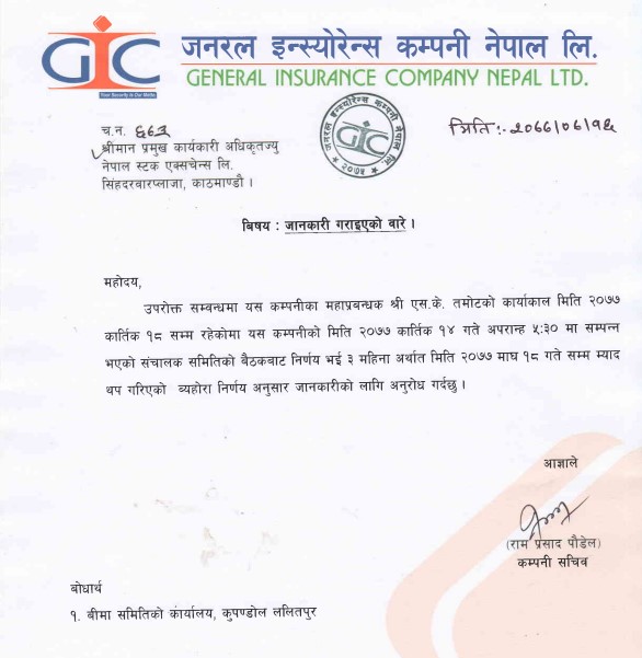 जनरल इन्स्योरेन्सका महाप्रबन्धक तमोटको कार्यकाल तीन महिना थप