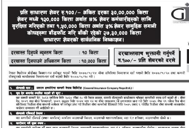 काठमाडौं । जनरल इन्स्योरेन्स कम्पनीले असोज ११ गतेदेखि सर्वसाधारणको लागि प्रथमिक शेयर (आईपीओ) निष्काशन गर्ने भएको छ । कम्पनीले एक सय रुपैयाँ अंकित दर मा ३० करोड रुपैयाँ बराबरको ३० लाख कित्ता आईपीओ निष्काशन गर्न लागेको हो ।