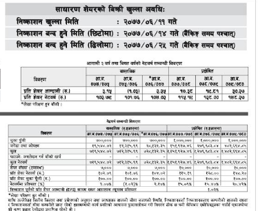 कम्पनीले निष्काशन गर्न लागेको उक्त आईपीओमा असोज ११ गतेदेखि १४ गतेसम्म आवेदन दिन सकिनेछ । शेयर निष्काशन तथा बिक्री प्रबन्धकमा एनआईवीएल क्यापिटल रहेको छ । न्यूनतम १० कित्तादेखि अधिकतम १० हजार कित्तासम्म आवेदन गर्न पाइने छ ।