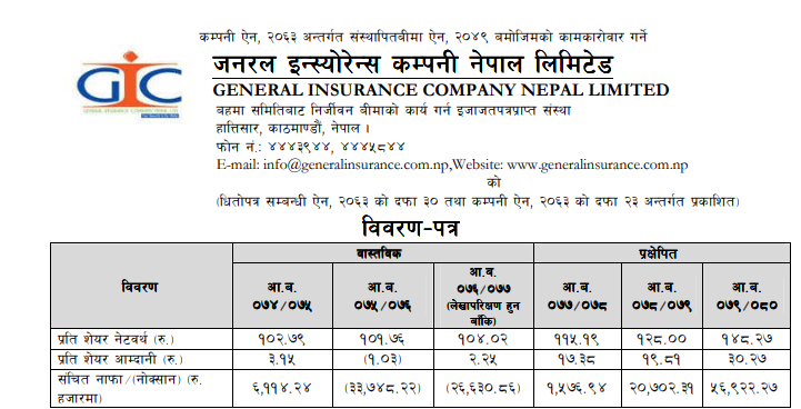 पहिलो कारोवारको लागि कम्पनीले किताबी मूल्य देखि किताबी मूल्यको तीन गुणासम्म रेञ्ज पाउने गर्छन । जनरल इन्स्योरेन्सको आर्थिक वर्ष ७६/७७ असार मसान्तको लेखापरीक्षण हुन् बाँकी वित्तीय विवरण भएकोले कम्पनीको आर्थिक वर्ष ७५/७६ को किताबी मूल्य १०१ रुपैयाँ ७६ पैसाको आधारमा रेञ्ज तय हुने सम्भावना छ।