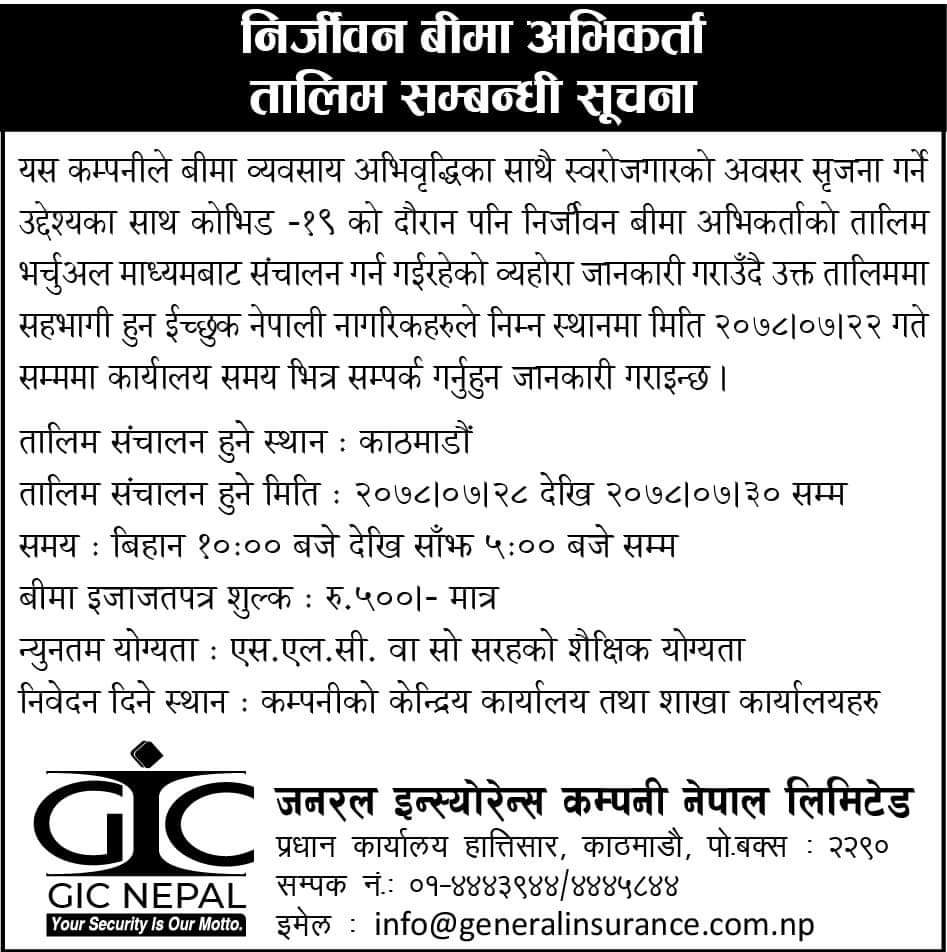 उक्त तालिममा सहभागि हुनका लागि कम्पनीमा सम्पर्क गर्न आग्रह गरेको छ । तालिम कार्तिक २८ गतेदेखि ३० गतेसम्म संचालन हुनेछ । तालिम काठमाडौंमा विहान १० बजेदेखि साझ ५ बजेसम्म संचालन हुनेछ । तालिम शुल्क ५ सय रुपैयाँ लाग्नेछ । ईच्छुकले एसएलसी वा सो सरह उर्तिण गरेको हुनुपर्नेछ ।