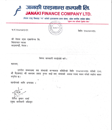 काठमाडौं । जानकी फाइनान्स कम्पनी लिमिटेडमा अध्यक्षमा बलराम प्रसाद गुप्ता चयन भएका छन् । कम्पनीको साउन १३ गते बसेको सञ्चालक समितिको बैठकले गुप्तालाई अध्यक्षमा चयन गरेको हो ।