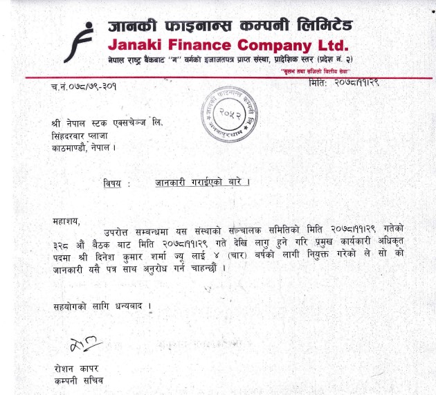 काठमाडौं । जानकी फाइनान्स लिमिटेडको प्रमुख कार्यकारी अधिकृत(सीईओ) मा दिनेश कुमार शर्मा नियुक्त भएका छन् । कम्पनीको फागुन २९ गते बसेको सञ्चालक समितीको बैठकले उनलाई सिइओ पदमा नियुक्त गर्ने निर्णय गरेको हो । उनलाई फागुन २९ गतेदेखि लागू हुने गरी आगामी चार वर्षको लागि सीईओ पदमा नियुक्त गरेको कम्पनीले एक सुचना जारी गर्दै जनाएको छ ।