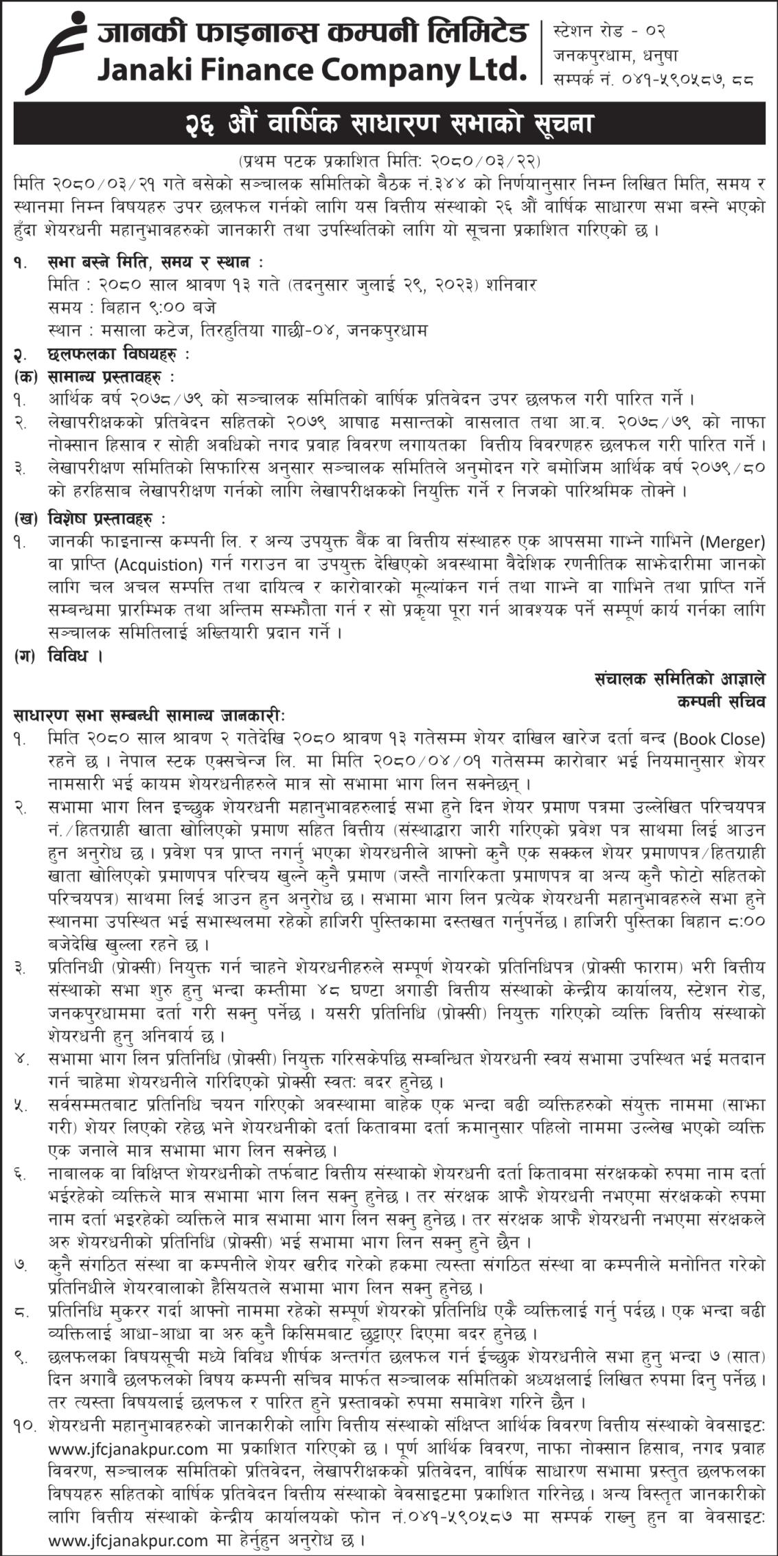 जानकी फाइनान्सले डाक्यो २६औं वार्षिक साधारण सभा, यस्ता छन् ४ एजेण्डा