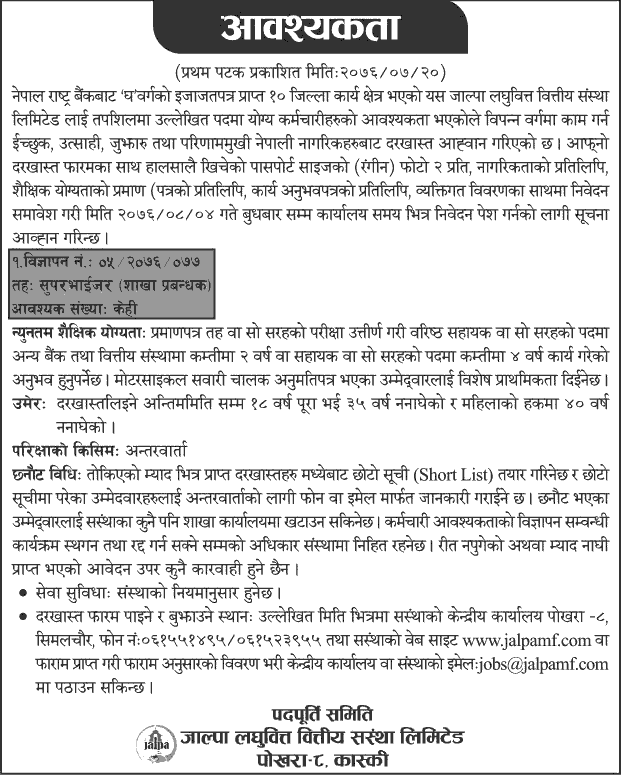 काठमाडौँ । जाल्पा लघुवित्त वित्तीय संस्थाले कर्मचारी माग गरेको छ । संस्थाले सुपरभाईजर (शाखा प्रबन्धक) पदका लागि केही कर्मचारी माग गरेको हो ।